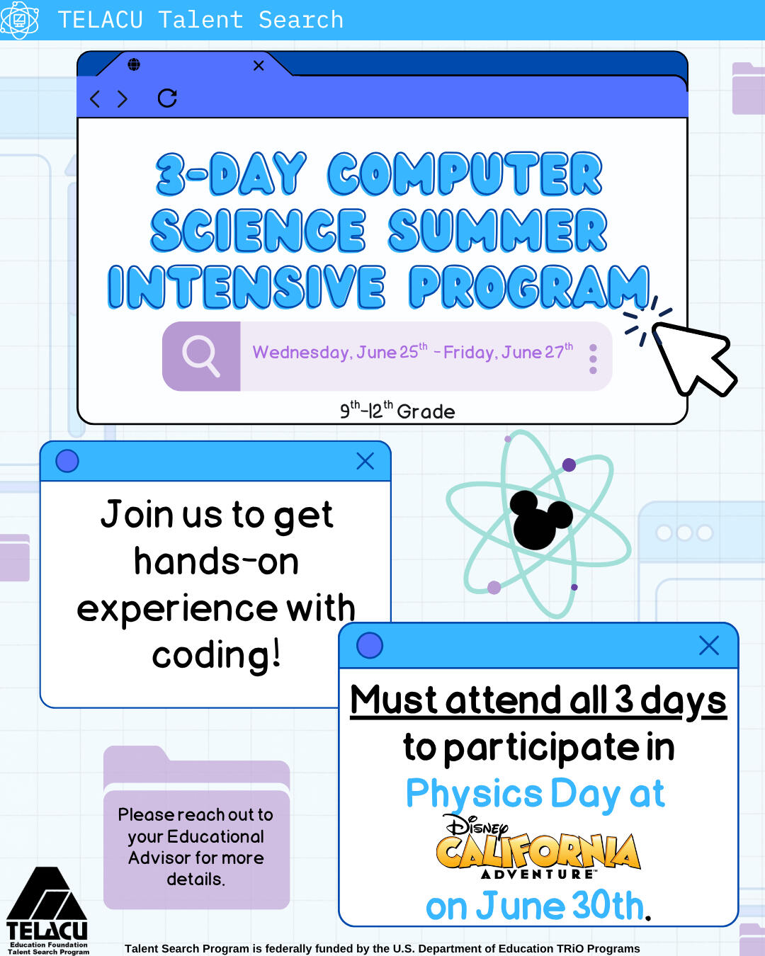 | 3-Day Computer Science Summer Intensive Program | June 25th-27th | 9th-12th |